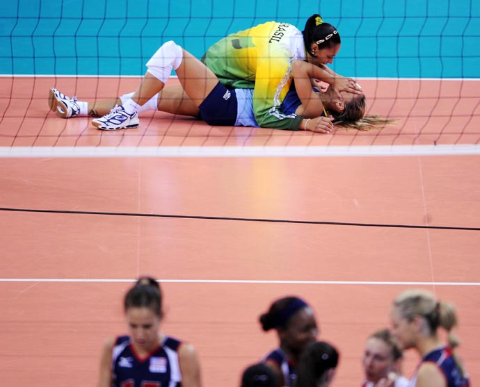 8月23日,巴西隊(duì)員(上)在比賽后慶祝。當(dāng)日,在北京奧運(yùn)會女排決賽中,巴西隊(duì)以3比1戰(zhàn)勝美國隊(duì),獲得冠軍。