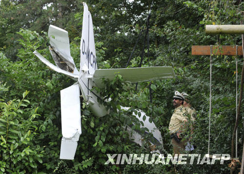 8月25日,在德國城市科隆,兩名警察在一座莊園內(nèi)查看墜毀的機動滑翔機。新華社/法新