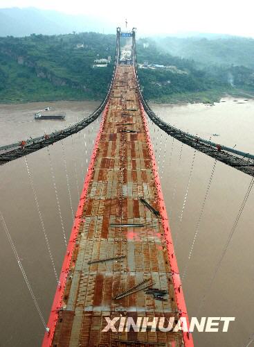 8月24日,隨著編號(hào)為“YZ24”的鋼箱梁吊裝到指定位置,重慶魚嘴長(zhǎng)江大橋主橋成功合龍。據(jù)介紹,重慶魚嘴長(zhǎng)江大橋全長(zhǎng)1438米,寬33米,大橋雙向6車道,主跨616米,設(shè)計(jì)時(shí)速100公里,預(yù)計(jì)2009年內(nèi)通車。 | |