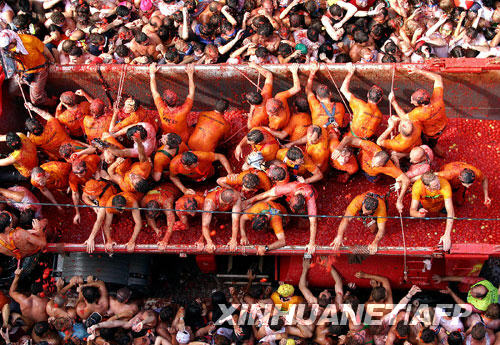8月27日,在西班牙首都馬德里以西300公里的布尼奧爾,人們在傳統(tǒng)節(jié)日“番茄大戰(zhàn)”活動(dòng)中互擲番茄。新華社/法新