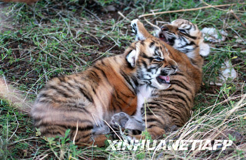 這張8月29日發(fā)布的照片顯示,兩頭華南虎幼仔在距南非約翰內(nèi)斯堡600多公里的老虎谷內(nèi)嬉戲。