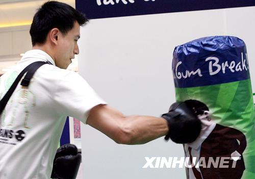 9月16日,一名白領(lǐng)在“減壓房”擊打沙袋進行“減壓”。