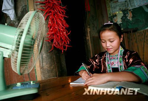 9月23日,在廣西融水苗族自治縣桿洞鄉(xiāng)黨鳩苗寨,一位苗族小女孩在電風(fēng)扇旁溫習(xí)功課。國慶前夕,位于黔桂交界處大苗山深處的廣西融水縣桿洞鄉(xiāng)黨鳩苗寨用上了電網(wǎng)電。桿洞鄉(xiāng)位于大苗山深處摩天嶺山脈,此前主要靠山村小水電供電。 | |