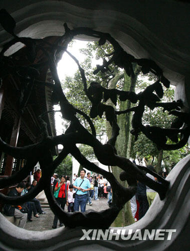 當(dāng)日是國慶黃金周的第六天,蘇州古典園林獅子林內(nèi)造型別致的各式花窗,令前來游覽的中外游客陶醉其中,大飽眼福。