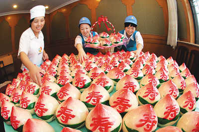 隨著中國傳統(tǒng)佳節(jié)重陽節(jié)的到來,壽桃、重陽糕等節(jié)日食品開始在京城熱銷。圖為10月5日,北京一家小吃店的服務(wù)員正在裝重陽壽桃禮籃。