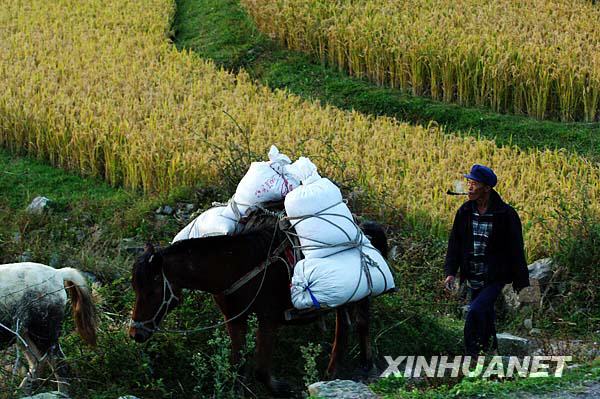 10月7日,貴陽市花溪區(qū)高坡鄉(xiāng)大洪村農(nóng)民運送剛收割的稻谷回家。眼下貴陽已進入秋糧收割高峰期,農(nóng)民們正利用好天氣加緊搶收稻谷,顆粒歸倉。 |