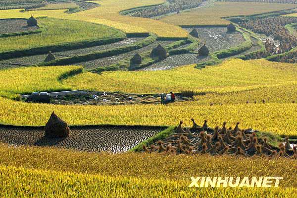 10月7日在貴陽市花溪區(qū)高坡鄉(xiāng)拍攝的稻田。眼下貴陽已進入秋糧收割高峰期,農(nóng)民們正利用好天氣加緊搶收稻谷,顆粒歸倉。 | |