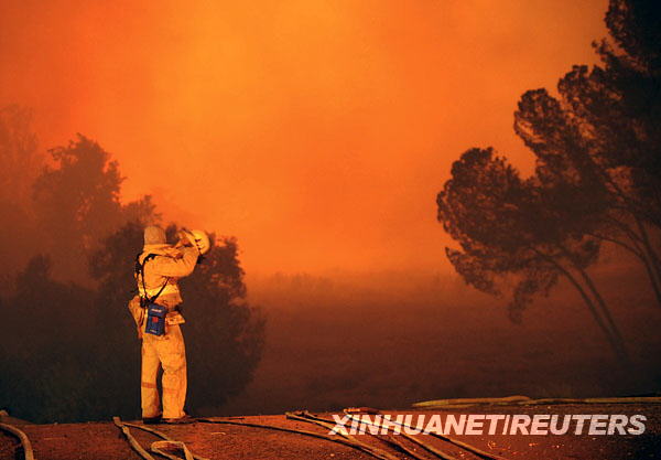 10月14日,在美國加利福尼亞州洛杉磯市以北的格拉納達山,一名消防員做滅火前的準(zhǔn)備工作。