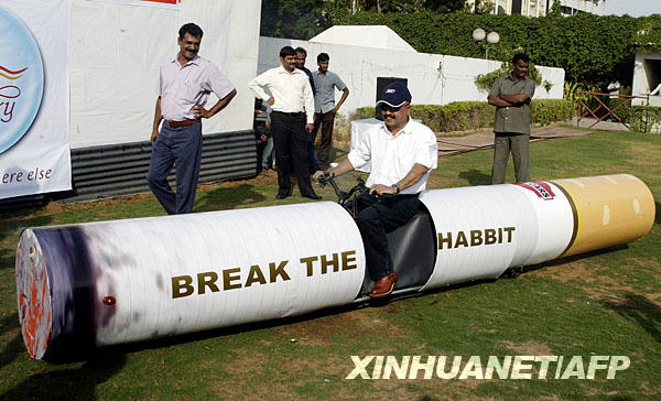 10月25日,在印度的海德拉巴,汽車(chē)設(shè)計(jì)師蘇達(dá)卡爾·亞達(dá)夫坐在一輛香煙造型的汽車(chē)?yán)铩嗊_(dá)夫制作這輛“香煙”汽車(chē)是為了支持印度政府在全國(guó)范圍內(nèi)實(shí)施公共場(chǎng)所禁煙令。新華社/法新