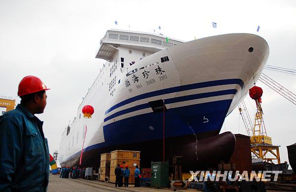 10月30日,大型豪華客滾船“渤海珍珠”輪在山東黃海造船廠順利下水。