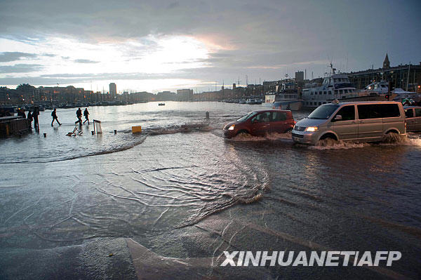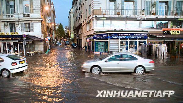11月2日,在法國南部馬賽港,人們駕駛汽車從洪水侵襲的街頭駛過。據(jù)法國營救機構(gòu)稱,法部分地區(qū)由于受暴雨侵襲致使大批人員撤離家園。新華社/法新