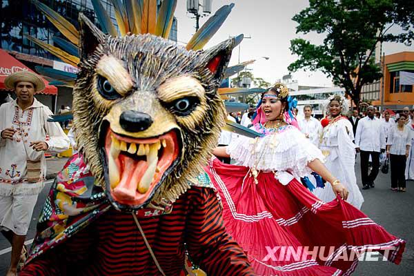 11月3日,在巴拿馬首都巴拿馬城,身著傳統(tǒng)服裝的民眾參加國慶節(jié)慶祝游行。