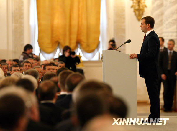 11月5日,俄羅斯總統(tǒng)梅德韋杰夫(右)在首都莫斯科的克里姆林宮發(fā)表其總統(tǒng)任期內(nèi)的首份國(guó)情咨文。包括俄總理普京、聯(lián)邦委員會(huì)(議會(huì)上院)主席米羅諾夫、國(guó)家杜馬(議會(huì)下院)主席格雷茲洛夫、東正教全俄大牧首阿列克謝二世等800余名代表聽取了此次的國(guó)情咨文。