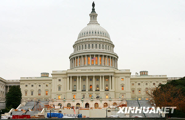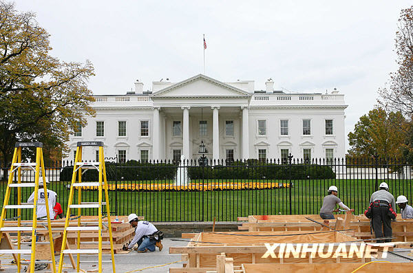 11月5日,在美國首都華盛頓,建筑工人在白宮北門搭建觀禮臺。已當(dāng)選下屆美國總統(tǒng)的奧巴馬2009年1月在國會宣誓就職后,將在這里舉行慶祝儀式。白宮、國會等處目前正在進(jìn)行新總統(tǒng)就職典禮的搭臺施工,準(zhǔn)備迎接奧巴馬宣誓就職。