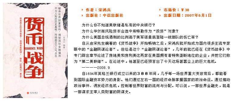 應(yīng)該說基本表達了我對此書及此問題的總體看法:“這本書印證了我多年研究所形成的一個觀念,即誰控制了貨幣誰就能支配一切;不過,我也同樣希望作者講述的