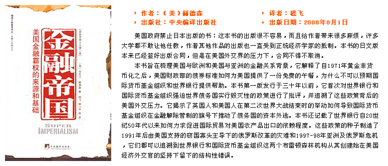 邁克爾·赫德森的這本輝煌的具有毀滅性沖擊力的著作將引起正統(tǒng)經(jīng)濟(jì)學(xué)家深深的不安和憤怒的反擊。古典經(jīng)濟(jì)學(xué)家不喜歡人們提起帝國(guó)主義的丑陋現(xiàn)實(shí)。赫德森是當(dāng)前世界上少數(shù)幾位用令人吃驚的角度看待老問題的經(jīng)濟(jì)思想家。