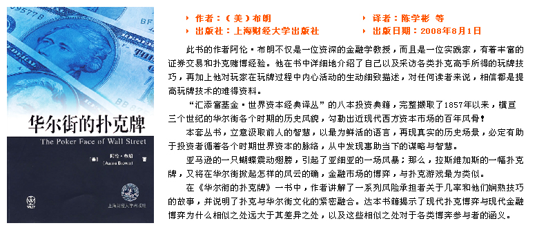 揣摸賭徒在賭桌上的心理 比自殺更安全 十分之五的門(mén)檻 在非理性的包圍中泰然處之 讓我們做筆交易 比峭壁、潮汐和星星更有耐性;如夜晚的黑暗一洋無(wú)盡和耐心 注釋參考目錄 撲克的歷史與涵義 賭博的歷史與涵義 金融與賭博 特別資料 |