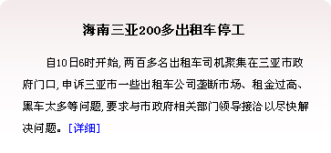 引發(fā)三亞出租車罷運(yùn)的導(dǎo)火索,諸如“份錢過(guò)高”、“黑車橫行”等,幾乎與重慶出租車罷運(yùn)事件毫無(wú)二致。如果存在于國(guó)內(nèi)出租車業(yè)“份錢過(guò)高”的通病,都需要以出租車司機(jī)罷運(yùn)的方式來(lái)解決,更將對(duì)社會(huì)矛盾的求解起到一個(gè)非常不好的示范效應(yīng)。[詳情] | |