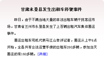 7月29日起,一次出租車司機(jī)集體停運(yùn)的事件在這個(gè)城市發(fā)生,為期約4天。7月30日一天,就有7列火車的旅客大量滯留在銀川火車站。[詳情] | |