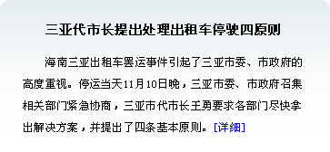 三亞出租車司機(jī)罷運(yùn)所要反映的問(wèn)題其實(shí)與重慶的問(wèn)題大體一致。而問(wèn)題的普遍存在,才是被有些人憂心忡忡的所謂“連鎖反應(yīng)”注定無(wú)法避免的真正原因,而并非是由“開放、溫和的心態(tài)妥善地處理突發(fā)事件”導(dǎo)致的。[詳情] | |