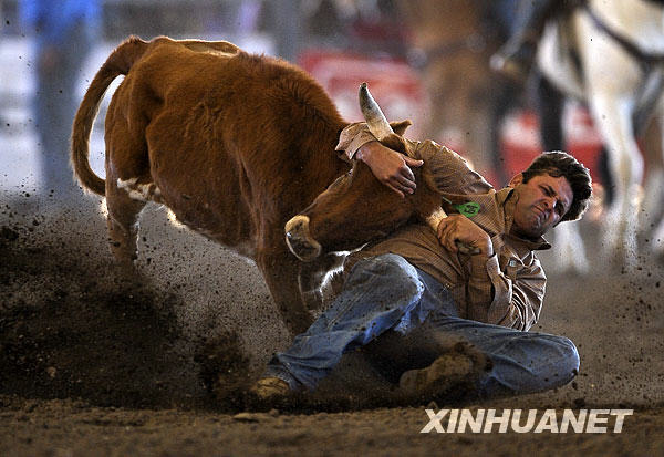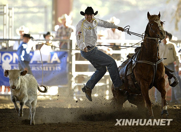 11月16日,來(lái)自內(nèi)華達(dá)州拉斯維加斯的選手賈森在套牛比賽中。當(dāng)日,2008加利福尼亞專業(yè)牛仔競(jìng)技大會(huì)在加州諾科市舉行,來(lái)自加州、內(nèi)華達(dá)和亞利桑那州的專業(yè)牛仔競(jìng)技選手參加為期三天的比賽。牛仔競(jìng)技源自牛仔在放牧過(guò)程中的各種騎術(shù)、馴馬和擒牛等技巧,如今演變成有規(guī)則觀賞性強(qiáng)的競(jìng)技比賽,深受北美人的喜愛(ài),每年僅美國(guó)專業(yè)牛仔競(jìng)技協(xié)會(huì)舉辦的比賽就接近百場(chǎng)。