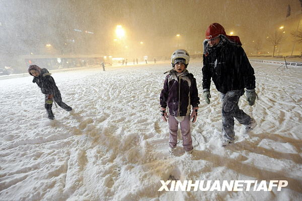 11月23日,在芬蘭首都赫爾辛基,人們在雪后的溜冰場玩耍。近日,歐洲部分地區(qū)遭遇了今冬的首場暴風(fēng)雪。新華社/法新