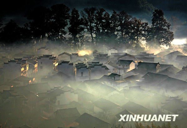11月25日早晨拍攝的煙霧彌漫的婺源石城。清晨雨后放晴,江西婺源石城粉墻黛瓦的古民居在煙霧中若隱若現(xiàn),與傲霜紅楓交相輝映,美不勝收。