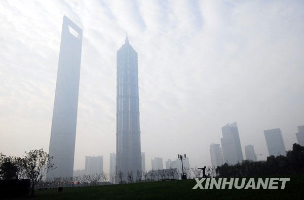 11月26日拍攝的大霧籠罩的上海金茂大廈和環(huán)球金融中心。當(dāng)日清晨,上海出現(xiàn)大霧,崇明島上霧氣最濃,最低能見(jiàn)度僅為50米。當(dāng)?shù)貧庀笈_(tái)發(fā)出大霧黃色預(yù)警信號(hào)。新華社發(fā)
