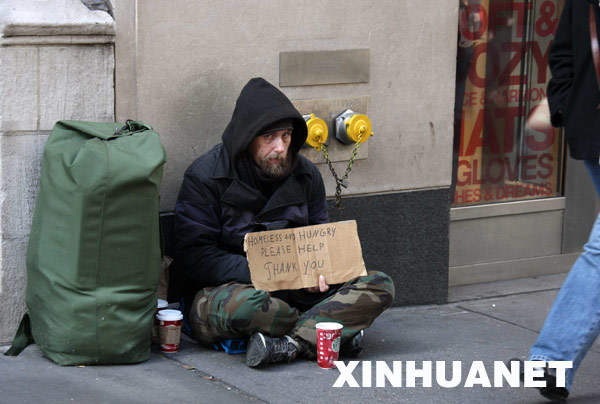 12月5日,美國(guó)勞工部公布的數(shù)據(jù)顯示,今年11月份美國(guó)非農(nóng)業(yè)部門就業(yè)崗位減少53.3萬個(gè),為1974年12月份以來的最大減幅,失業(yè)率上升到6.7%,為15年來的最高點(diǎn)。這是11月11日,一名流浪漢在美國(guó)紐約曼哈頓街頭乞討。 |