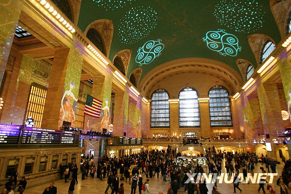 12月5日,在美國(guó)紐約的大中央車站,圣誕萬(wàn)花筒燈光秀映射在車站大廳的穹頂和墻壁上。