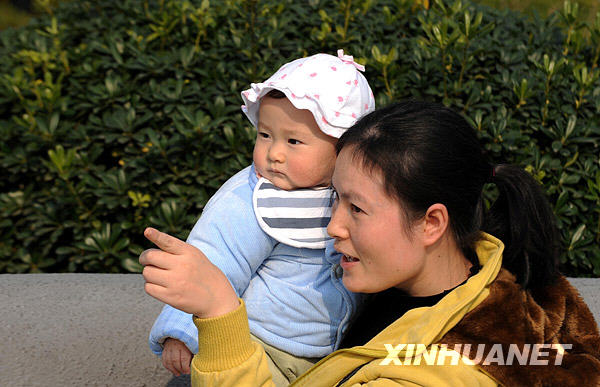 12月11日,長(zhǎng)沙一位母親帶著小寶寶在廣場(chǎng)曬太陽(yáng)。