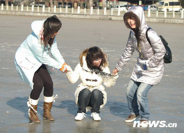 12月21日,受冷空氣的影響,北京氣溫驟降,白天最高氣溫達(dá)到零下8度,是今年京城入冬以來最寒冷的一天。這是當(dāng)天在北京什剎海的一些年輕人不怕天氣寒冷,在結(jié)了冰的湖面上嬉戲游玩。