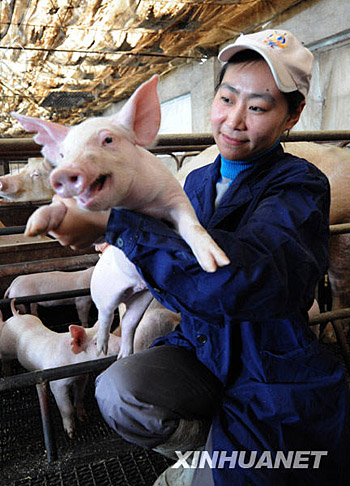 12月25日,天津薊縣建和養(yǎng)殖場場長鄭娜在查看豬仔。2001年底,大學(xué)畢業(yè)一年多、在北京一家軟件公司任市場部經(jīng)理的北京女孩鄭娜,放棄了優(yōu)越的都市生活,來到天津薊縣東施古鎮(zhèn)南孟莊村她父親創(chuàng)辦的養(yǎng)豬場當(dāng)上“豬倌”。幾年來,在鄭娜的努力下,養(yǎng)殖場從最初仔豬存欄100頭,發(fā)展到存欄1000多頭,年產(chǎn)仔豬5000頭。她還建立起養(yǎng)豬信息網(wǎng),牽頭成立了養(yǎng)豬協(xié)會,幫助當(dāng)?shù)仞B(yǎng)豬戶科學(xué)養(yǎng)殖,并生產(chǎn)出“無抗肉”銷往日本,F(xiàn)在,鄭娜正計(jì)劃用5年時間,把養(yǎng)豬場發(fā)展成為存欄萬頭,集飼養(yǎng)、加工為一體的現(xiàn)代化生態(tài)園區(qū)。 | |