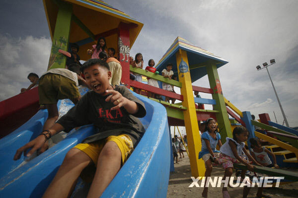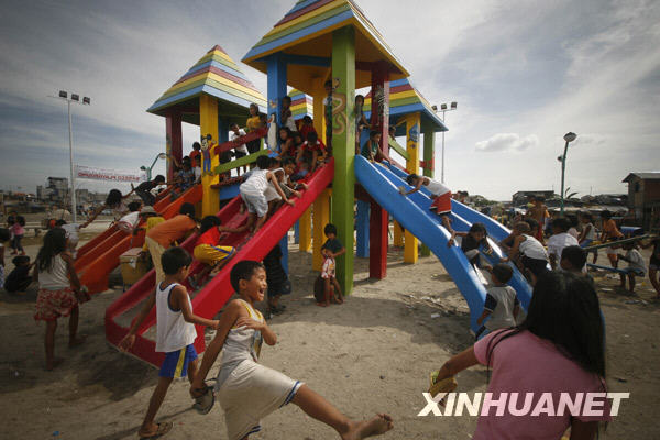 12月26日,在菲律賓首都馬尼拉的一個貧民窟,孩子們在剛設立的兒童游樂場內(nèi)嬉戲。