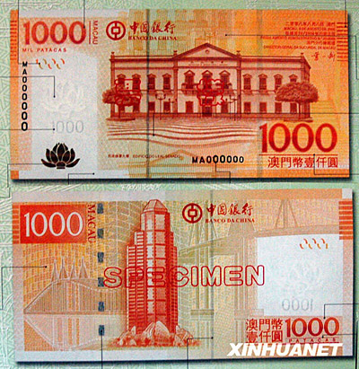 圖為中國銀行2008年澳門元新版鈔票1000澳門元票樣。1000澳門元鈔票的正面主景圖案為民政總署大樓。