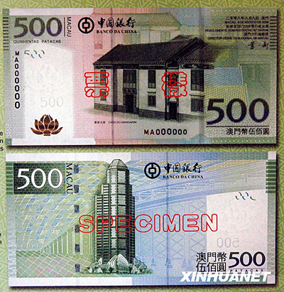 圖為中國銀行澳門元新版鈔票500澳門元票樣。500澳門元鈔票的正面主景圖案為鄭家大屋。 |