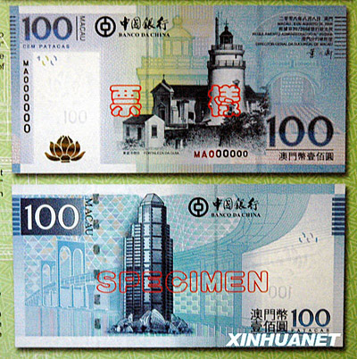 圖為中國銀行澳門元新版鈔票100澳門元票樣。100澳門元鈔票的正面主景圖案為東望洋炮臺。 |
