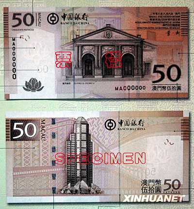 圖為中國銀行澳門元新版鈔票50澳門元票樣。50澳門元鈔票的正面主景圖案為崗頂劇院。