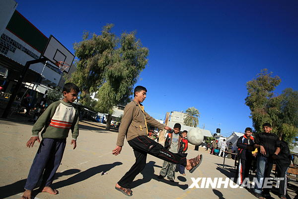 1月6日,在加沙地帶的小鎮(zhèn)拉法,逃離家園的巴勒斯坦兒童在一個聯(lián)合國設(shè)立的救援中心內(nèi)游戲。