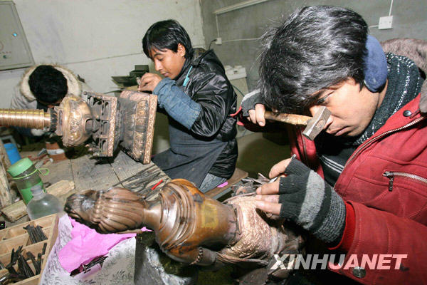 尼泊爾技師巴格達(前)在鏨刻銅質佛像(1月13日攝)。安徽帝雅文化遺產(chǎn)研究保護中心針對宗教藝術品的市場需求,從尼泊爾聘請六名富有經(jīng)驗的鏨刻技師,開發(fā)宗教銅器藝術品。
