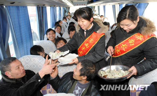 1月14日,交運集團工作人員為農(nóng)民工送“春運餃子”。當(dāng)日,山東交運集團開通的“民工返鄉(xiāng)直通車”來到濟南一建筑工地,接送來自貴州安龍鎮(zhèn)的50多名農(nóng)民工兄弟返鄉(xiāng)過年。在出發(fā)儀式上,工作人員為他們送上了對聯(lián)、福字和熱氣騰騰的“春運餃子”。