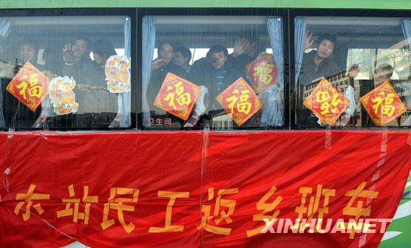 1月14日,農(nóng)民工們登上“民工返鄉(xiāng)直通車”。