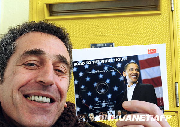 1月6日,在法國(guó)西北部的朗迪代克,克勞德·邁登貝格在郵筒前展示他創(chuàng)意并制作的“奧巴馬DVD賀卡”。賀卡由一張明信片和一張錄制有即將上任的美國(guó)當(dāng)選總統(tǒng)奧巴馬的影片和圖片的DVD碟片組成。該賀卡將于1月20日奧巴馬宣誓就職當(dāng)天向公眾發(fā)售。新華社/法新