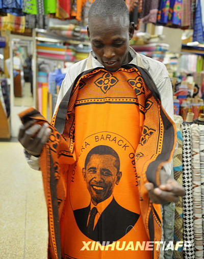 1月16日,在肯尼亞首都內(nèi)羅畢,一位店主在展示印有美國當選總統(tǒng)奧巴馬頭像的圍巾。奧巴馬將于本月20日正式就任美國總統(tǒng)。新華社/法新