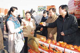 | 衢州市柯城區(qū)委副書記胡松(右二)、柯城區(qū)人大副主任鄭曉霞(右三)、衢州市柯城區(qū)副區(qū)長王國強(qiáng)(右一)等衢州柯城區(qū)領(lǐng)導(dǎo)走到北京新發(fā)地農(nóng)產(chǎn)品批發(fā)市場銷售現(xiàn)場向顧客介紹衢州椪柑。 | 由國際柑橘學(xué)會(huì)主辦、中國柑橘學(xué)會(huì)和華中農(nóng)業(yè)大學(xué)承辦的第11屆國際柑橘大會(huì)2008年10月間在武漢召開,會(huì)上發(fā)布,中國柑橘種植面積和產(chǎn)量目前均躍居世界第一。2008年全國柑桔普遍豐產(chǎn),預(yù)計(jì)總產(chǎn)量達(dá)2200萬噸左右,這年,浙江衢州柯城椪柑種植再獲豐收,產(chǎn)量近40萬噸,柑橘是柯城區(qū)農(nóng)民經(jīng)濟(jì)收入的主要來源,全區(qū)80%的鄉(xiāng)(鎮(zhèn))村主要收入來源于柑橘,2008年柑桔產(chǎn)業(yè)收入達(dá)4.8億,占全區(qū)農(nóng)業(yè)總產(chǎn)值的54.58%,在農(nóng)民收入中的占比達(dá)到70%。但由于國際金融危機(jī)的影響,水果消費(fèi)需求下降,柑橘銷售直接關(guān)系到當(dāng)?shù)貜V大桔農(nóng)的切身利益,為此,衢州市柯城區(qū)委、區(qū)政府急桔農(nóng)所急、想桔農(nóng)所想,重拳出擊,區(qū)里領(lǐng)導(dǎo)分別帶隊(duì)于今年春節(jié)前赴北京、哈爾濱、杭州等城市開展“衢州椪柑推介會(huì)”等促銷活動(dòng),促進(jìn)椪柑的銷售。