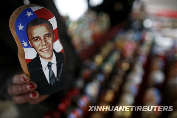 1月19日,在保加利亞首都索非亞的一家商店里,營業(yè)員拿著繪有美國當(dāng)選總統(tǒng)奧巴馬頭像的俄羅斯套娃。來自民主黨的當(dāng)選總統(tǒng)貝拉克·奧巴馬的就職儀式即將于1月20日舉行。新華社/路透