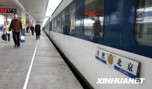 1月20日,合肥至北京的直達(dá)臨時(shí)特快旅客列車在合肥火車站準(zhǔn)備發(fā)車。當(dāng)日,合肥火車站首次開(kāi)設(shè)合肥至北京的直達(dá)臨時(shí)旅客列車。據(jù)合肥火車站介紹,臨客以直達(dá)特快形式開(kāi)行在安徽春運(yùn)史上還是首次。Z174列車11:18從合肥站發(fā)車,同日20:44到達(dá)北京。返回的Z173次列車從北京發(fā)車時(shí)間為9:45,到達(dá)合肥是同日19:08。