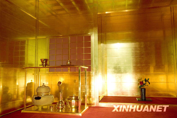 這是2月2日拍攝的在日本東京的黃金茶室。近日,一座金碧輝煌的黃金茶室亮相東京。該茶室長2.7米,寬2.55米,高2.5米。由日本長野一家公司以日本戰(zhàn)國時(shí)代末期封建領(lǐng)主豐臣秀吉1587年修建的黃金茶室為原型,1比1復(fù)制而成。該茶道室連同其中的金制茶具售價(jià)約為390萬美元。
