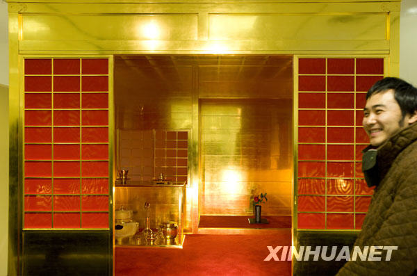 2月2日,一位觀眾從在日本東京展出的黃金茶室前走過。