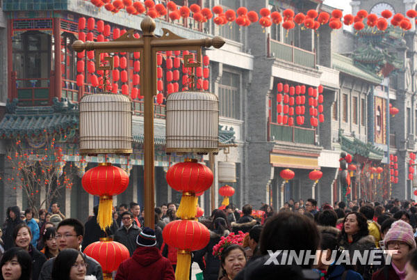北京前門(mén)大街鳥(niǎo)籠造型的路燈上懸掛了大紅燈籠,喜迎元宵佳節(jié)(2月8日攝)。